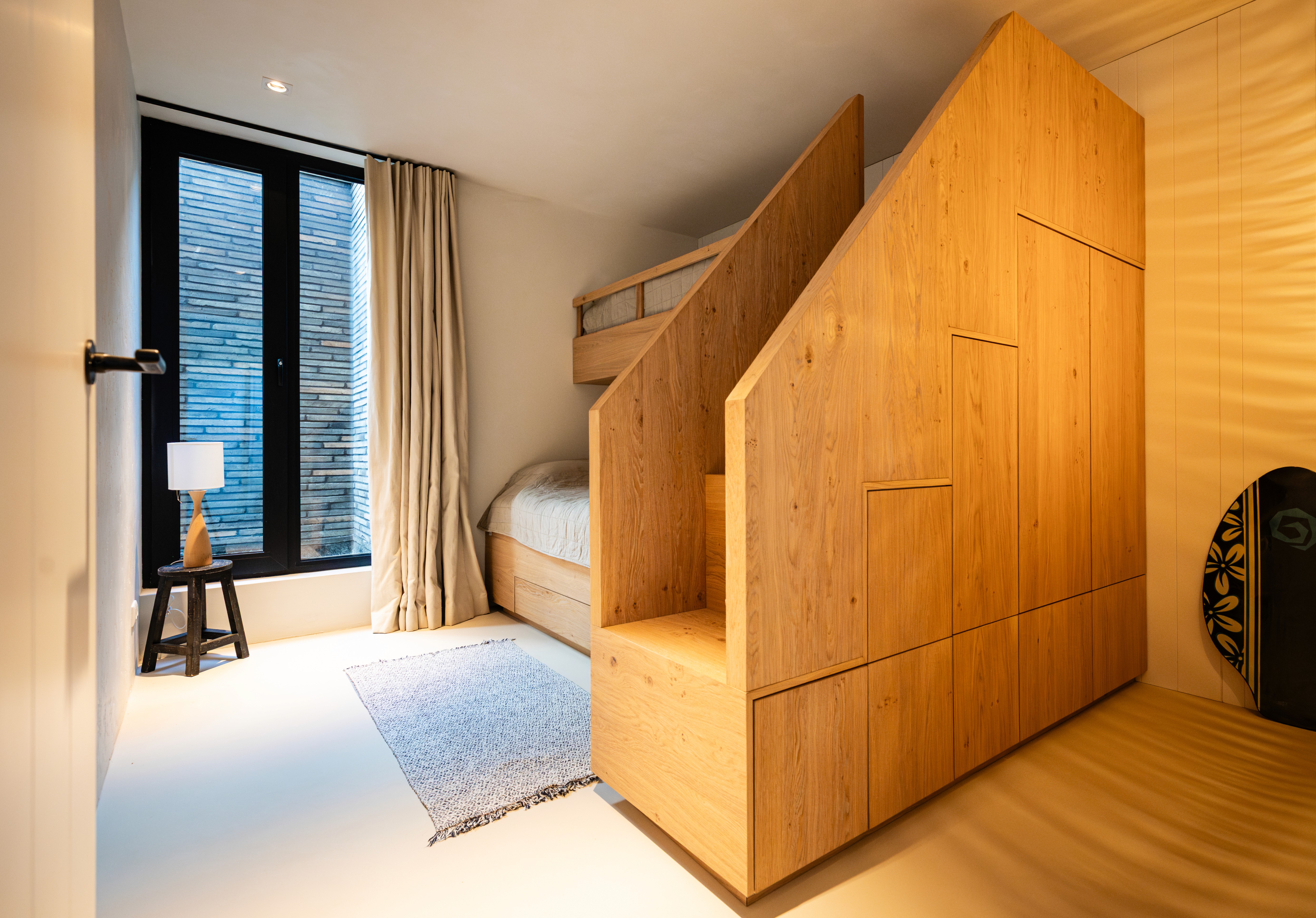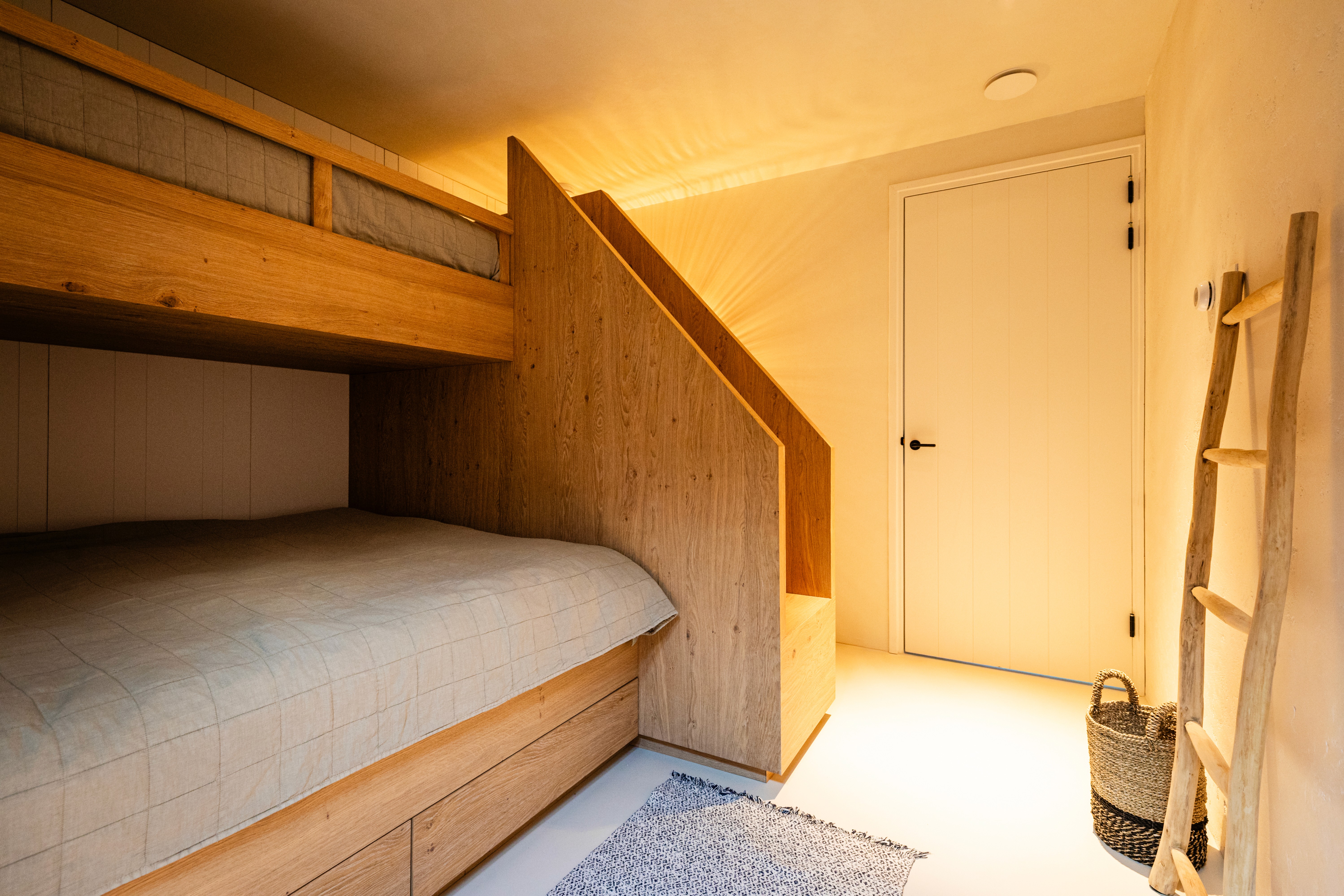 Het stapelbed met twee tweepersoonsbedden maakt het mogelijk om comfortabel meerdere gasten te ontvangen. Door de slimme opzet wordt de ruimte optimaal benut zonder in te leveren op rust en overzicht. Het gebruik van eikenhout in een strakke vormgeving geeft het geheel een tijdloos, duurzaam en functioneel karakter.