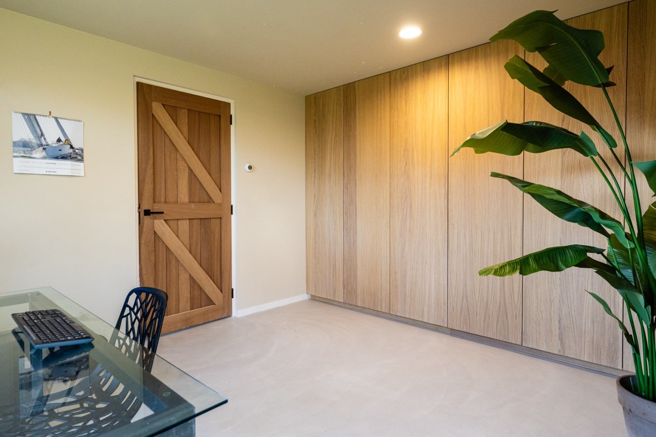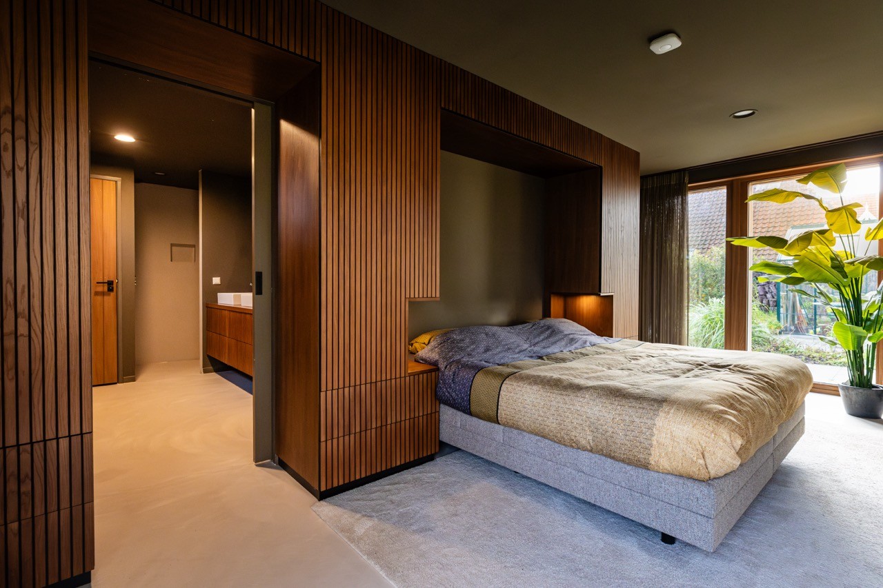 In deze woning realiseerden we een interieur waar functionaliteit naadloos overloopt tussen verschillende ruimtes. Het badkamermeubel, uitgevoerd in massief eiken met Japandi-geïnspireerde fronten, vormt één geheel met de kledingkast en bedombouw. Slimme details zoals push-to-open lades en een innovatieve wasgoedkast die toegankelijk is vanuit twee ruimtes maken het geheel even praktisch als stijlvol. In de slaapkamer creëert de muurvullende kast met verlichte nissen een serene sfeer. Het kantoor transformeerden we met een wandvullend maatwerk meubel in eikenhout, dat oogt als een architectonisch element maar volop bergruimte biedt.